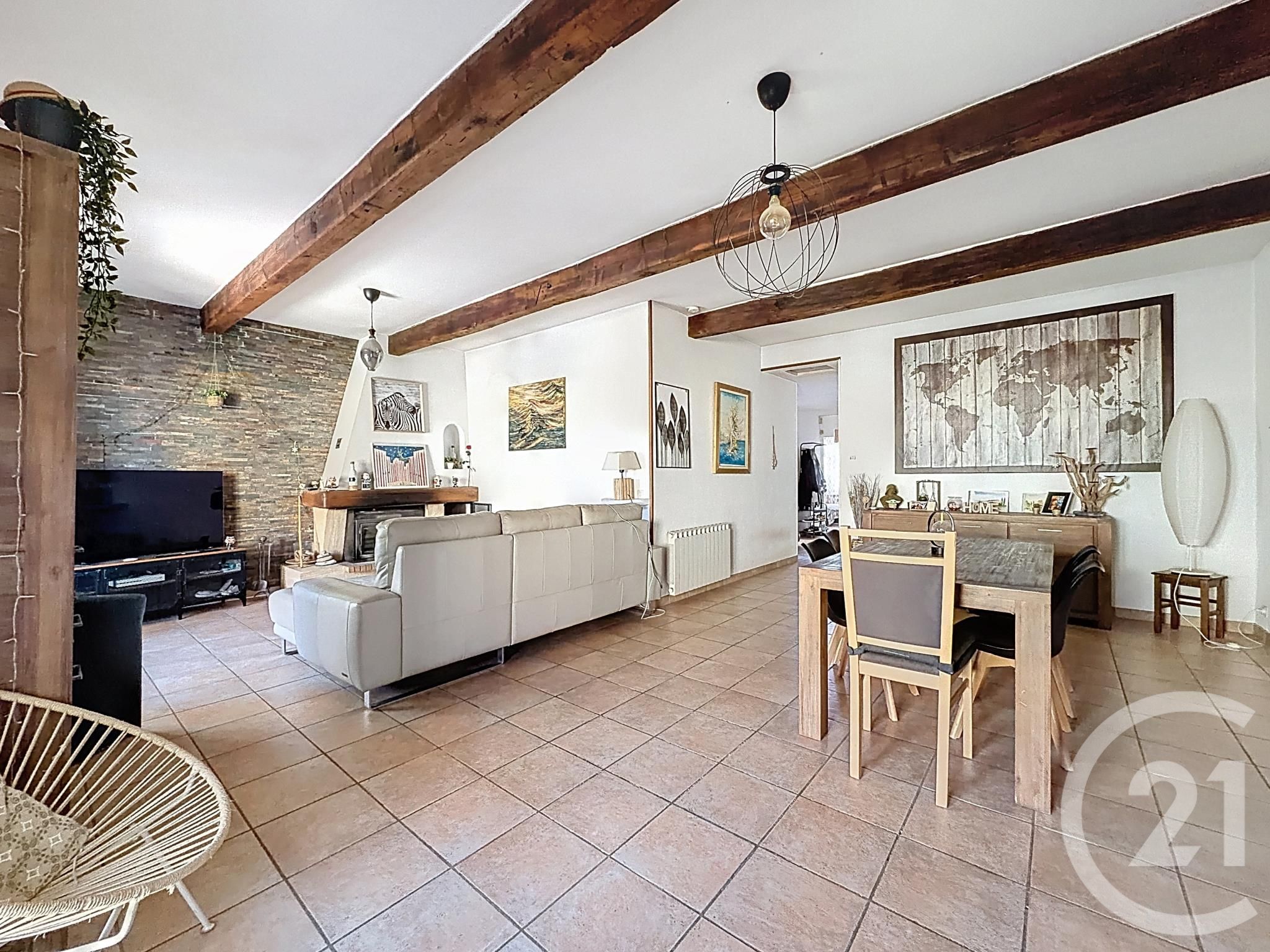 Une spacieuse pièce de vie lumineuse avec cheminée insert et climatisation réversible.